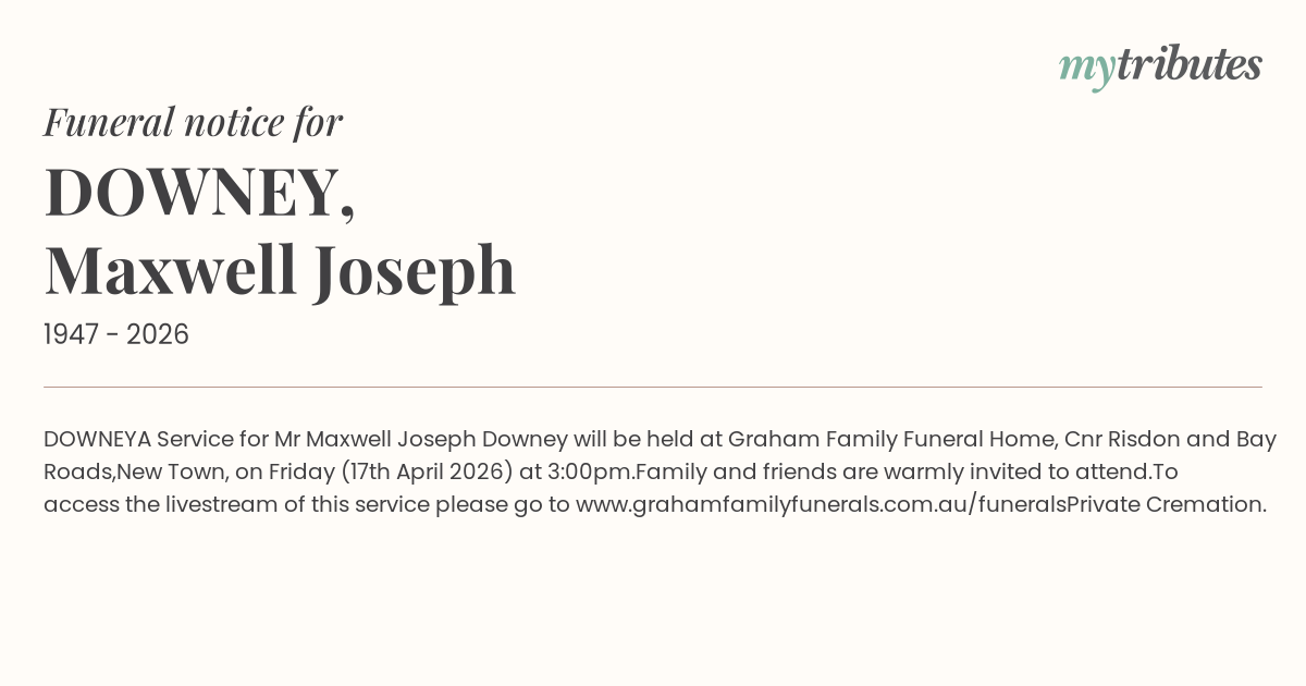 A Service for Mr Maxwell Joseph Downey will be held at Graham Family Funeral Home, Cnr Risdon and Bay Roads,