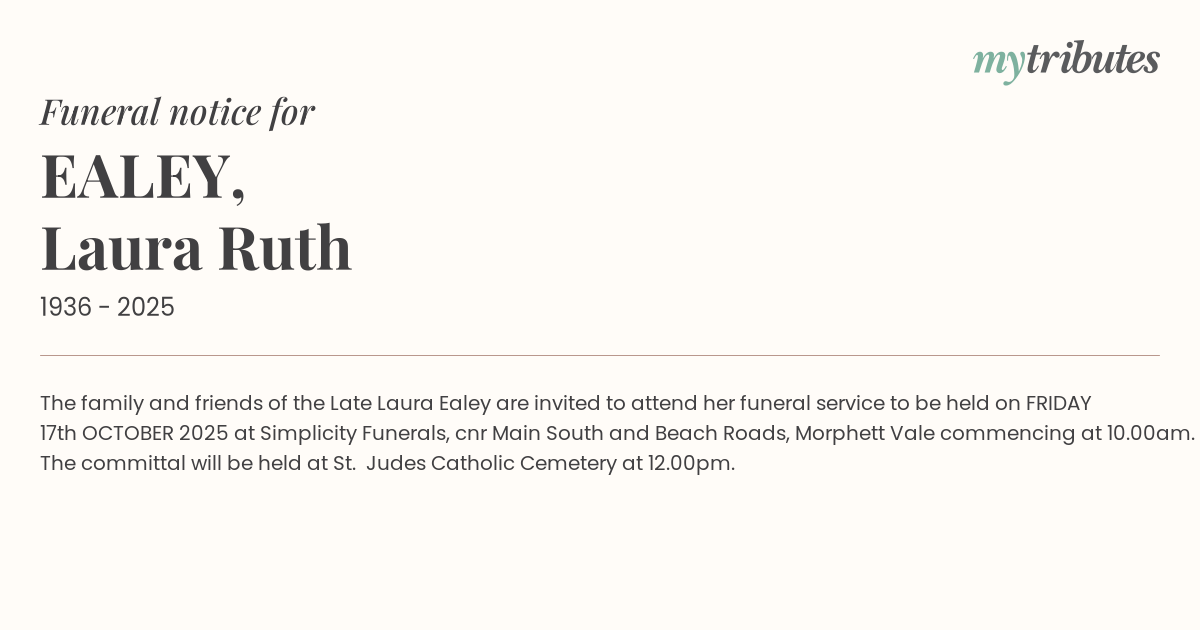 23°CThe family and friends of the Late Laura Ealey are invited to attend her funeral service to be held on FRIDAY 17th OCTOBER 2025 at Simplicity Funerals, cnr Main South and Beach Roads, Morphett Vale commencing at 10.00am. The committal will be held at St. Judes Catholic Cemetery at 12.00pm.
