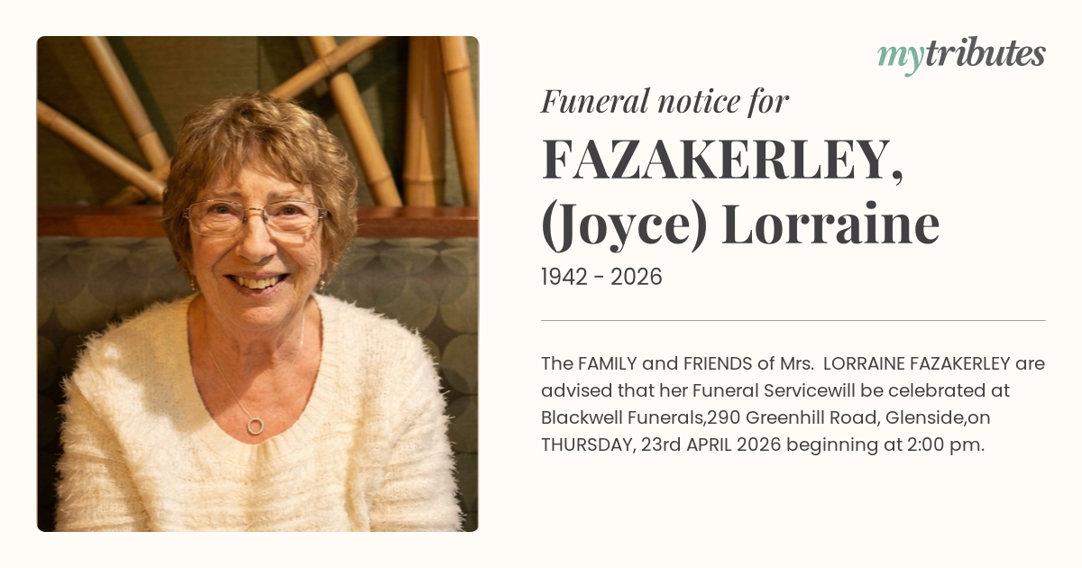 23°CThe FAMILY and FRIENDS of Mrs. LORRAINE FAZAKERLEY are advised that her Funeral Service