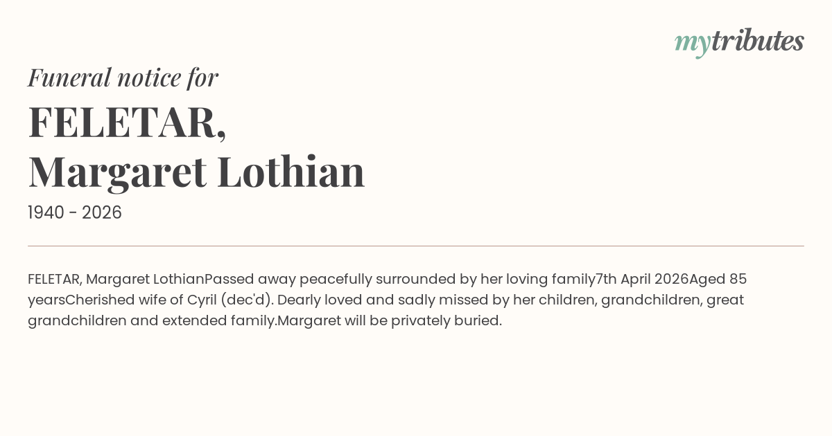 Cherished wife of Cyril (dec'd). Dearly loved and sadly missed by her children, grandchildren, great grandchildren and extended family.