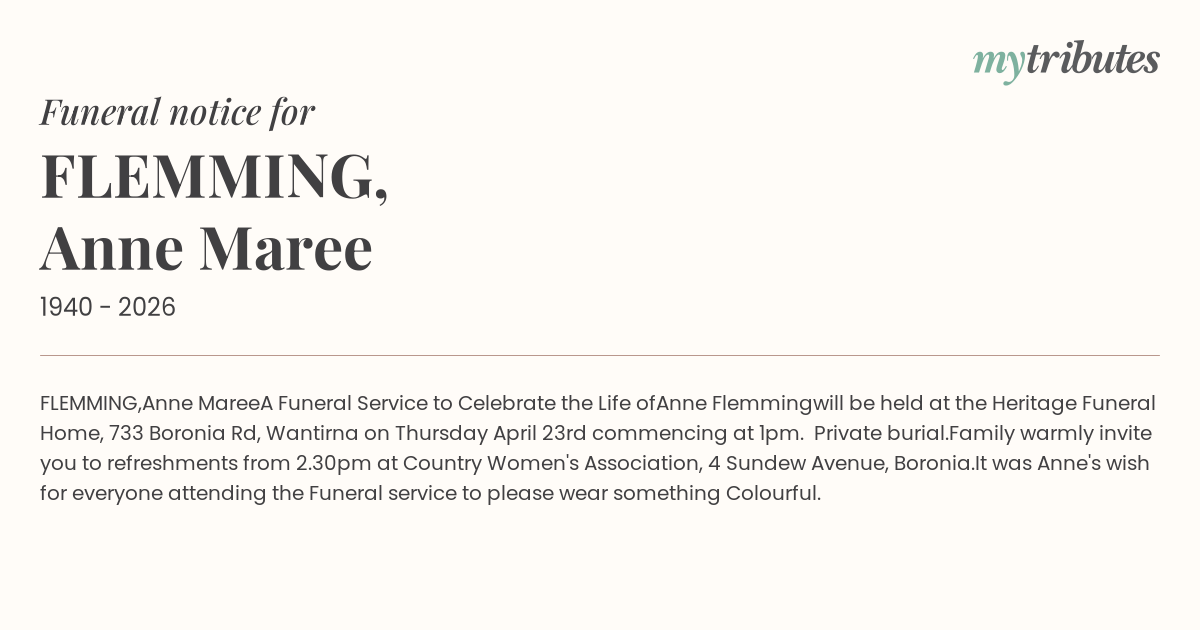 It was Anne's wish for everyone attending the Funeral service to please wear something Colourful.