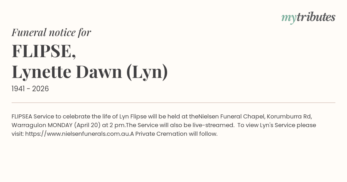 The Service will also be live-streamed. To view Lyn's Service please visit: https://www.nielsenfunerals.com.au.
