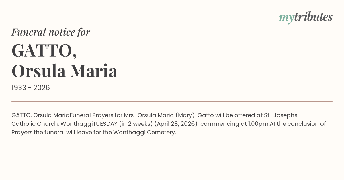 Funeral Prayers for Mrs. Orsula Maria (Mary) Gatto will be offered at