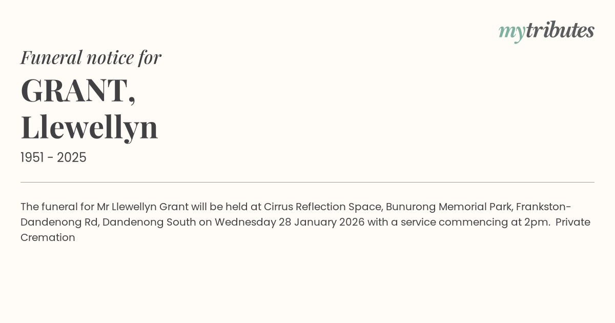 23°CThe funeral for Mr Llewellyn Grant will be held at Cirrus Reflection Space, Bunurong Memorial Park, Frankston-Dandenong Rd, Dandenong South on Wednesday 28 January 2026 with a service commencing at 2pm.
