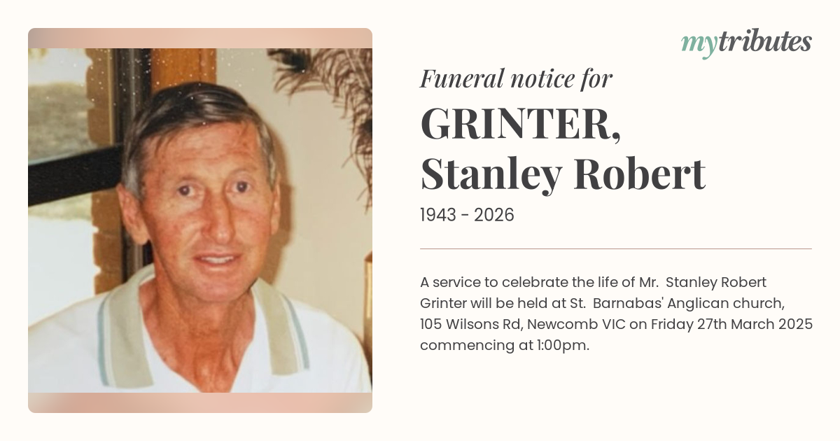 A service to celebrate the life of Mr. Stanley Robert Grinter will be held at St. Barnabas' Anglican church, 105 Wilsons Rd, Newcomb VIC on Friday 27th March 2025 commencing at 1:00pm.