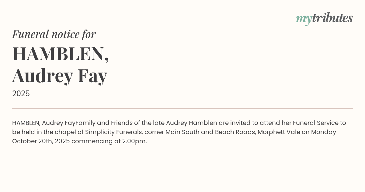 Family and Friends of the late Audrey Hamblen are invited to attend her Funeral Service to be held in the chapel of Simplicity Funerals, corner Main South and Beach Roads, Morphett Vale on Monday October 20th, 2025 commencing at 2.00pm.