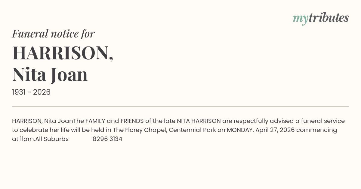 NITA HARRISON are respectfully advised a funeral service to celebrate her life will be held in The Florey Chapel, Centennial Park on MONDAY, April 27, 2026 commencing at 11am.