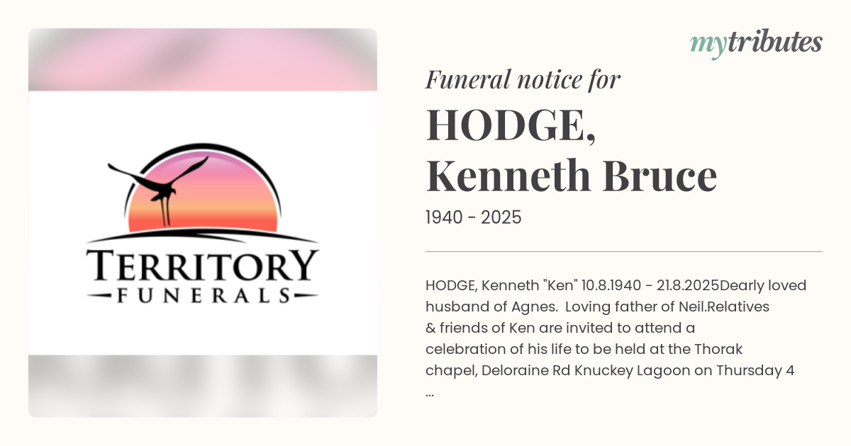 Relatives & friends of Ken are invited to attend a celebration of his life to be held at the Thorak chapel, Deloraine Rd Knuckey Lagoon on Thursday 4 September 2025 @ 10am.