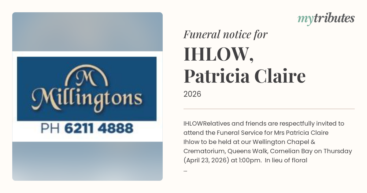Relatives and friends are respectfully invited to attend the Funeral Service for Mrs Patricia Claire Ihlow to be held at our Wellington Chapel & Crematorium, Queens Walk, Cornelian Bay on Thursday (April 23, 2026) at 1:00pm. In lieu of floral tributes, donations may be made to Heart Foundation of Australia in her memory and will be warmly received at the service.