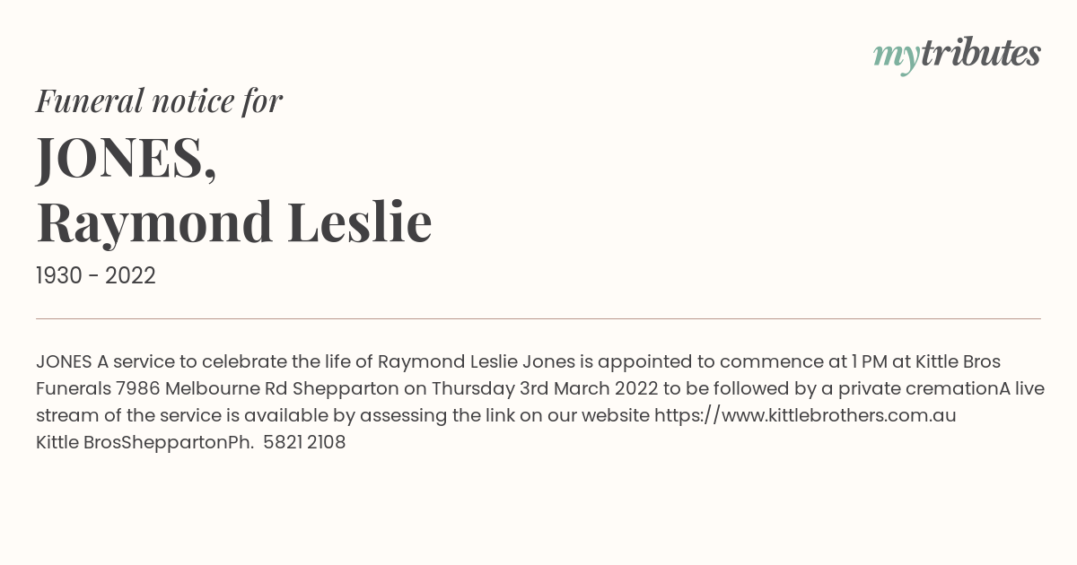 23°CJONES A service to celebrate the life of Raymond Leslie Jones is appointed to commence at 1 PM at Kittle Bros Funerals 7986 Melbourne Rd Shepparton on Thursday 3rd March 2022 to be followed by a private cremation