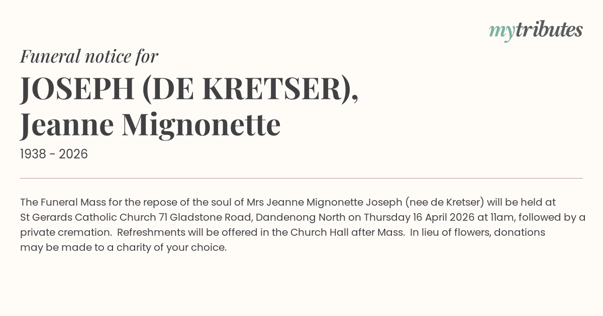 23°CThe Funeral Mass for the repose of the soul of Mrs Jeanne Mignonette Joseph (nee de Kretser) will be held at St Gerard’s Catholic Church 71 Gladstone Road, Dandenong North on Thursday 16 April 2026 at 11am, followed by a private cremation. Refreshments will be offered in the Church Hall after Mass. In lieu of flowers, donations may be made to a charity of your choice.