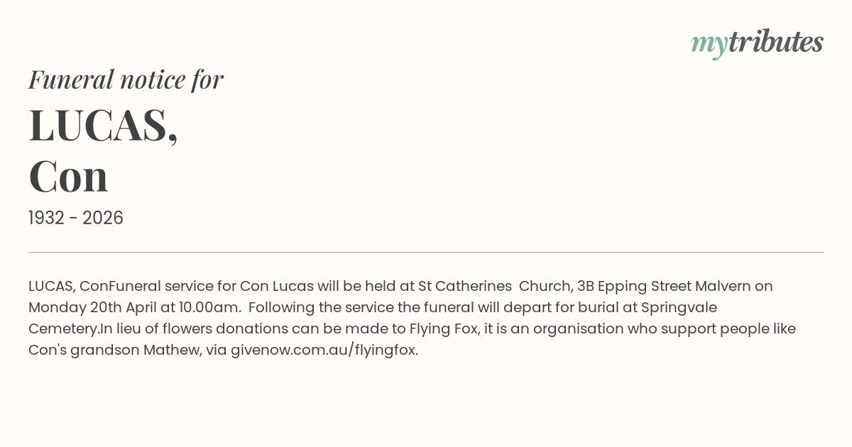 Con Lucas will be held at St Catherine’s Church, 3B Epping Street Malvern on Monday 20th