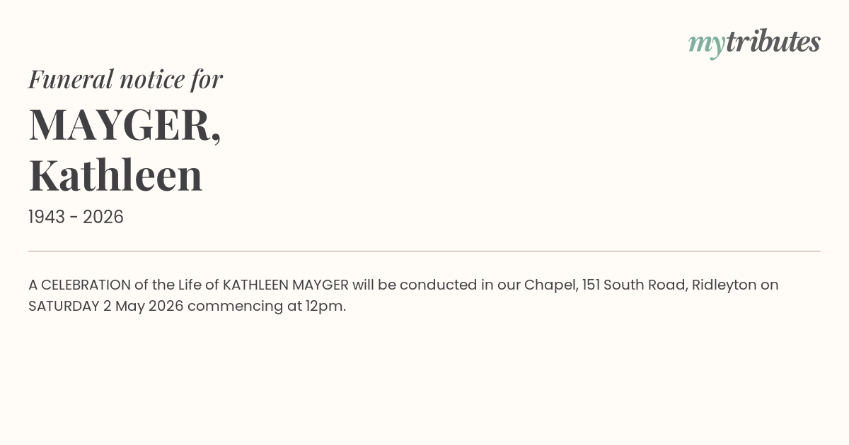 23°CA CELEBRATION of the Life of KATHLEEN MAYGER will be conducted in our Chapel, 151 South Road, Ridleyton on SATURDAY 2 May 2026 commencing at 12pm.