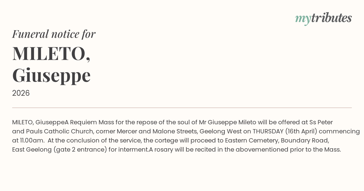 Mr Giuseppe Mileto will be offered at Ss Peter and Paul’s Catholic Church, corner Mercer and Malone Streets, Geelong West on THURSDAY (16th April) commencing at 11.00am. At the conclusion of the service, the cortege will proceed to Eastern Cemetery, Boundary Road, East Geelong (gate 2 entrance) for interment.