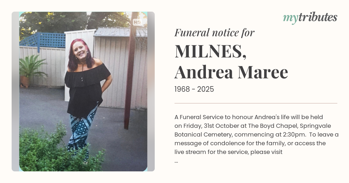 To leave a message of condolence for the family, or access the live stream for the service, please visit https://www.gardeniafunerals.com.au/view-tribute/andrea-milnes-GF250351/
