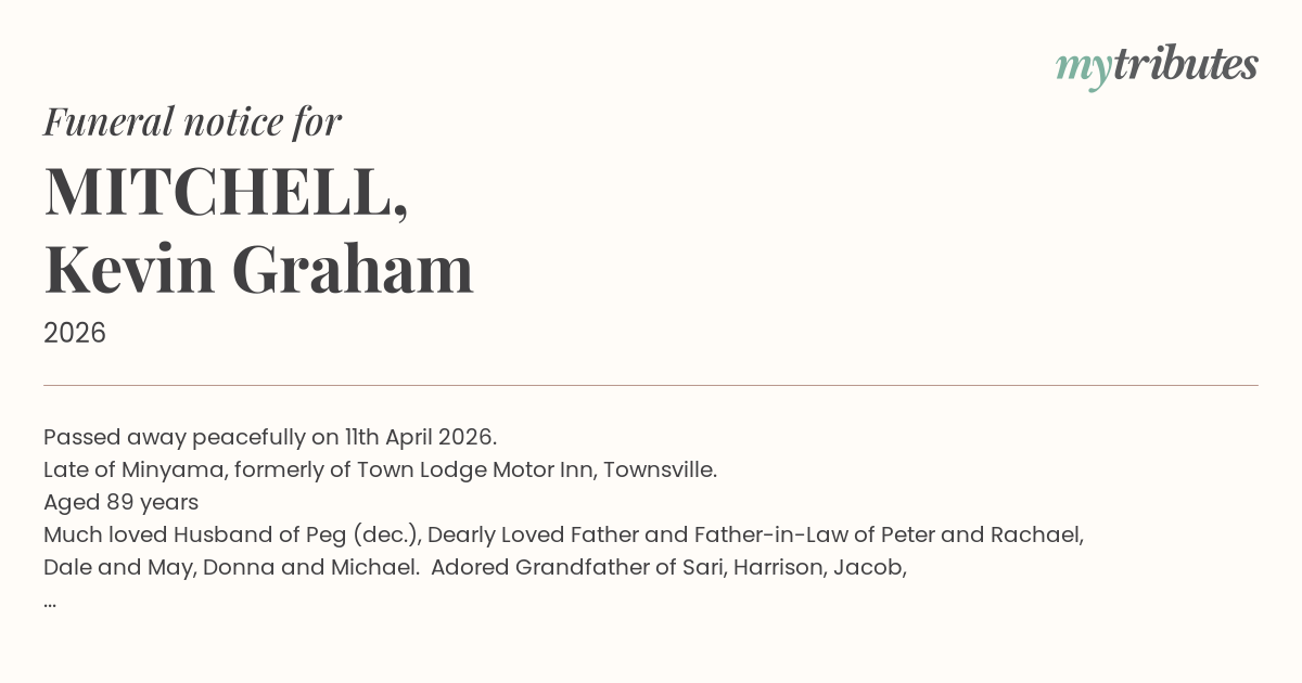 A celebration of Kevin's life will be held at Stella Maris Catholic Church, 10 Church Street, Maroochydore, this Wednesday 22nd April 2026 commencing at 1pm.