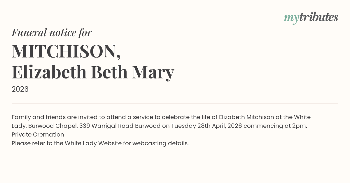 23°CFamily and friends are invited to attend a service to celebrate the life of Elizabeth Mitchison at the White Lady, Burwood Chapel, 339 Warrigal Road Burwood on Tuesday 28th April, 2026 commencing at 2pm.