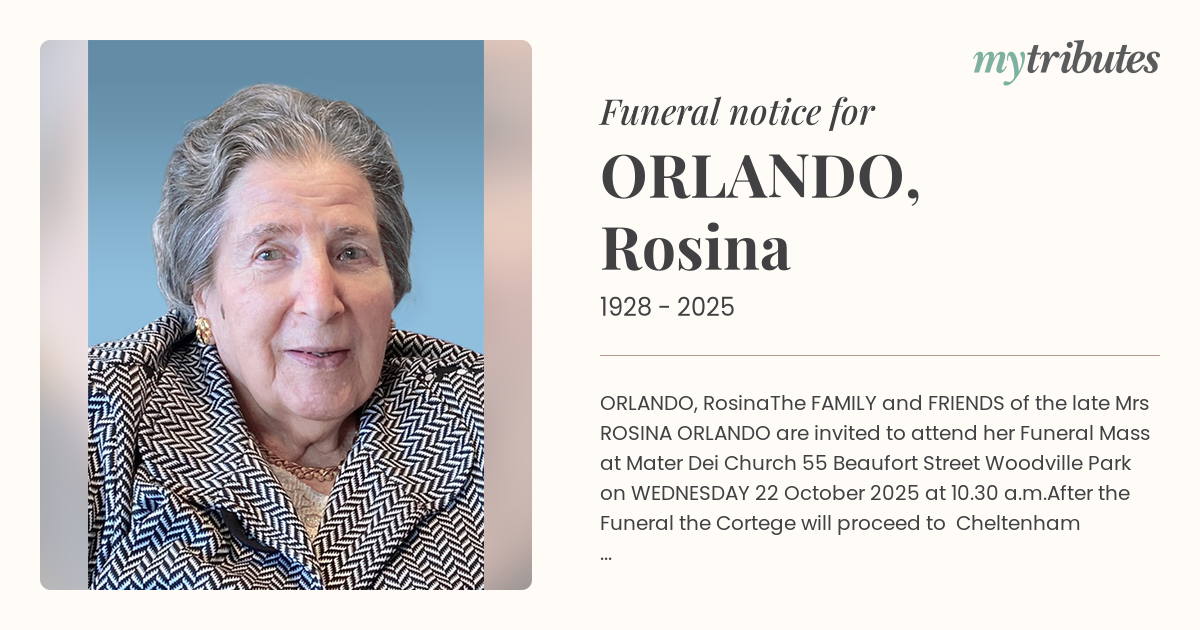 are invited to attend her Funeral Mass at Mater Dei Church 55 Beaufort Street Woodville Park on WEDNESDAY 22 October 2025 at 10.30 a.m.