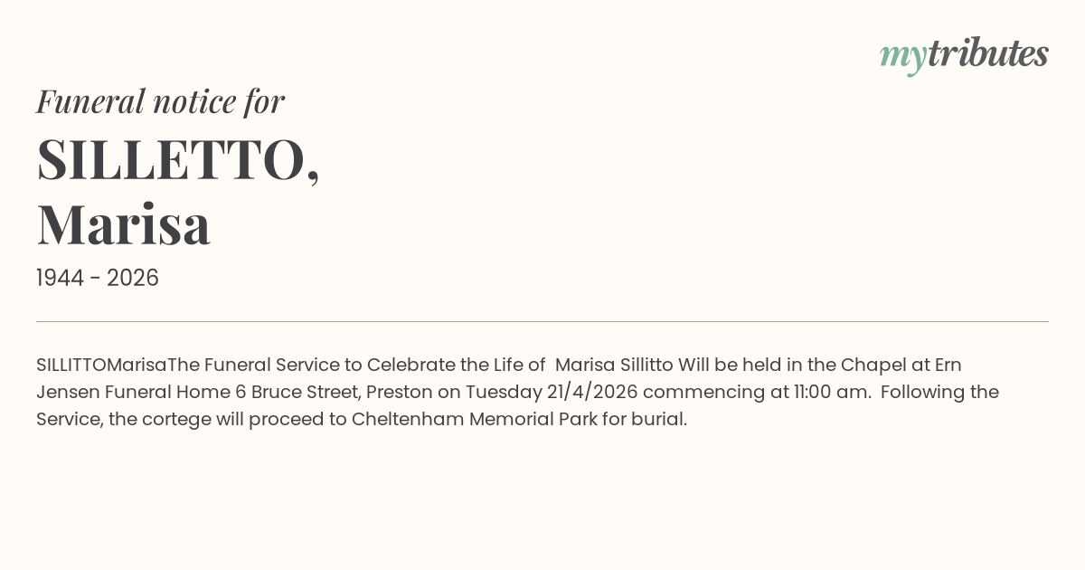 Following the Service, the cortege will proceed to Cheltenham Memorial Park for burial.