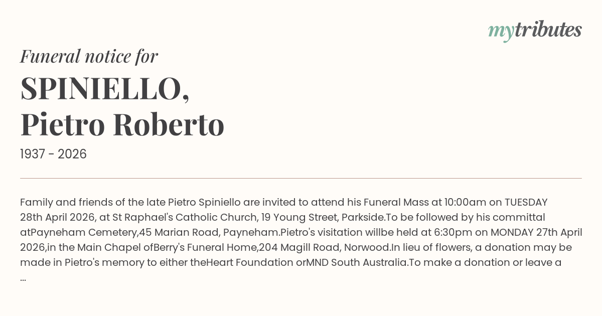 23°CFamily and friends of the late Pietro Spiniello are invited to attend his Funeral Mass at 10:00am on TUESDAY 28th April 2026, at St Raphael's Catholic Church, 19 Young Street, Parkside.