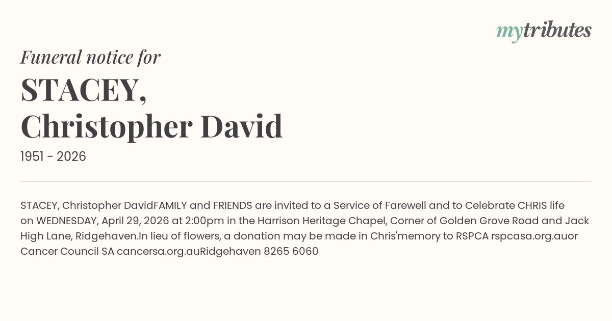 Celebrate CHRIS’ life on WEDNESDAY, April 29, 2026 at 2:00pm in the Harrison Heritage Chapel, Corner of Golden Grove Road and Jack High Lane, Ridgehaven.