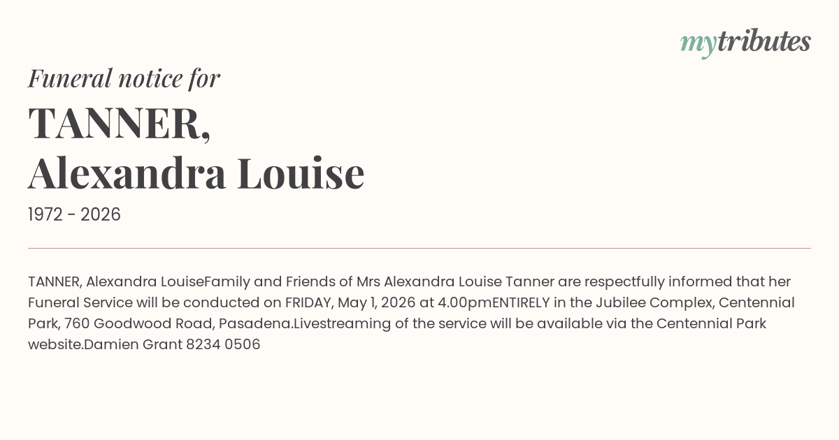 Family and Friends of Mrs Alexandra Louise Tanner are respectfully informed that her Funeral Service will be conducted on