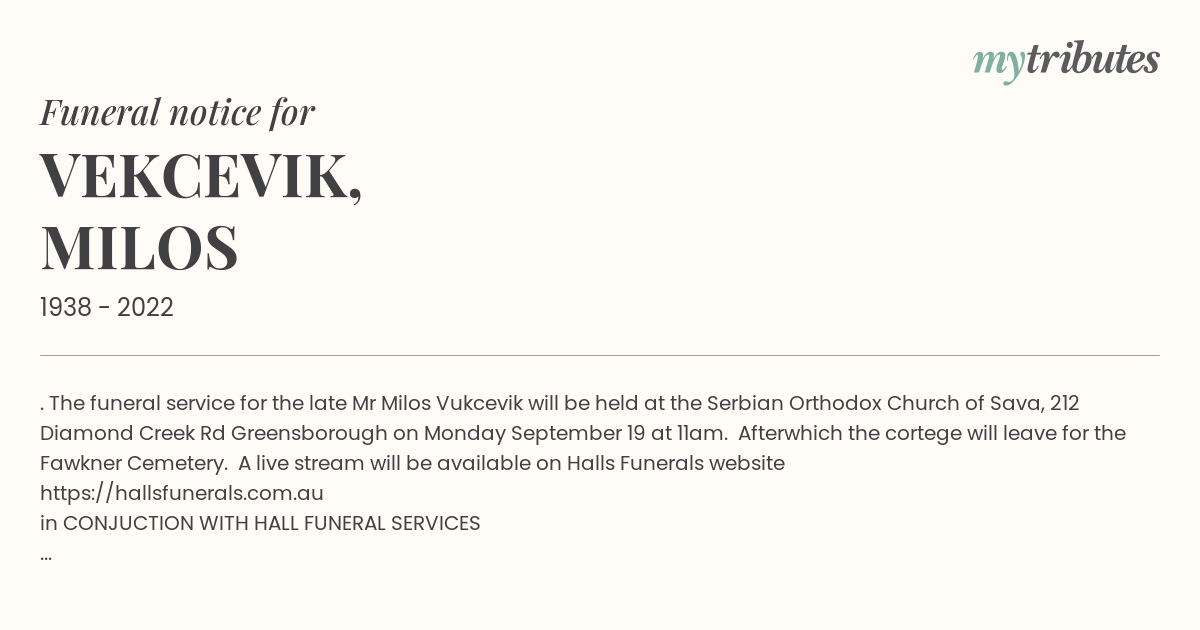 23°C. The funeral service for the late Mr Milos Vukcevik will be held at the Serbian Orthodox Church of Sava, 212 Diamond Creek Rd Greensborough on Monday September 19 at 11am. Afterwhich the cortege will leave for the Fawkner Cemetery. A live stream will be available on Halls Funerals website