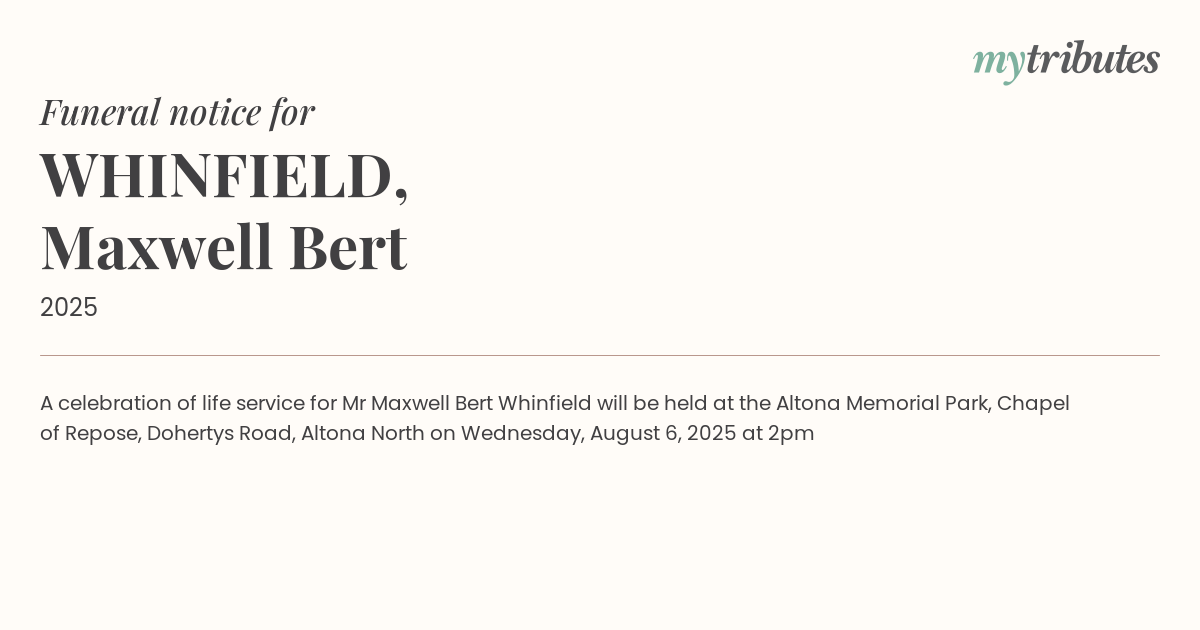23°CA celebration of life service for Mr Maxwell Bert Whinfield will be held at the Altona Memorial Park, Chapel of Repose, Doherty’s Road, Altona North on Wednesday, August 6, 2025 at 2pm