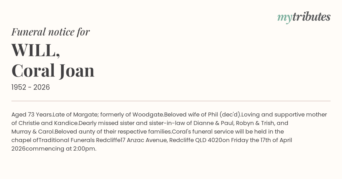 Coral's funeral service will be held in the chapel of