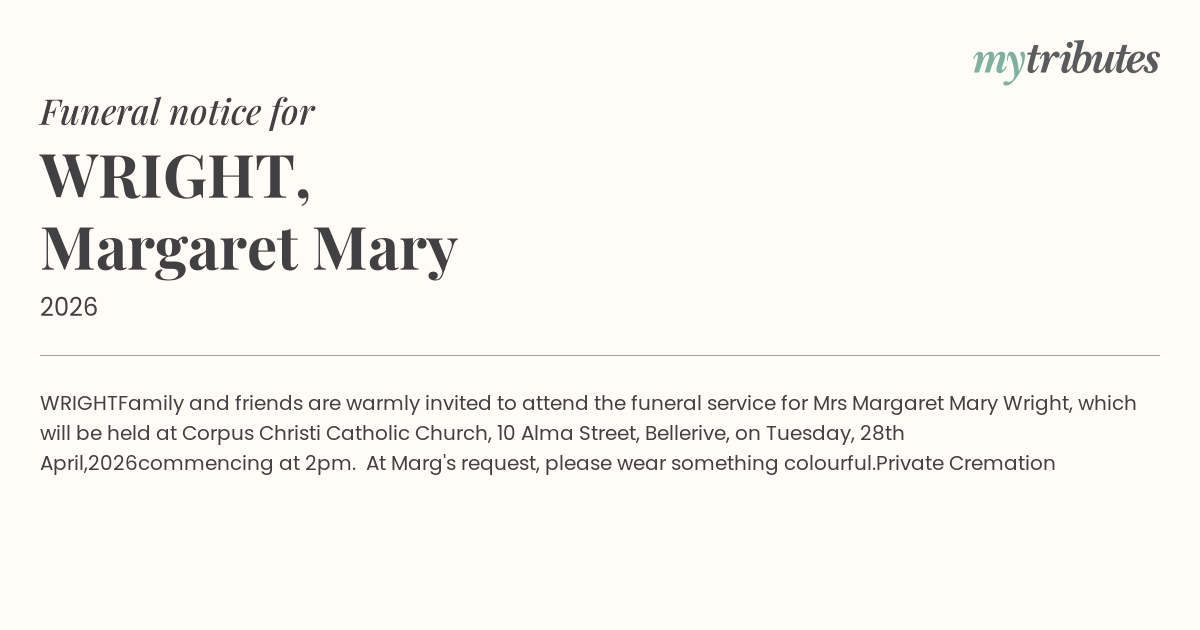 Family and friends are warmly invited to attend the funeral service for Mrs Margaret Mary Wright, which will be held at Corpus Christi